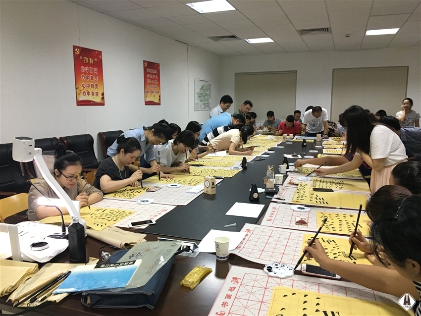 725日中午1230,書(shū)法班開(kāi)班,廣西書(shū)法家協(xié)會(huì)的蒙匯鵬老師先從執(zhí)筆姿勢(shì)、手法運(yùn)用、字體結(jié)構(gòu)等基礎(chǔ)理論知識(shí)進(jìn)行了講授,在實(shí)踐練習(xí)過(guò)程中,大家認(rèn)真臨摹,反復(fù)練習(xí),個(gè)個(gè)興趣盎然,現(xiàn)場(chǎng)氣氛濃厚,一片翰墨飄香。