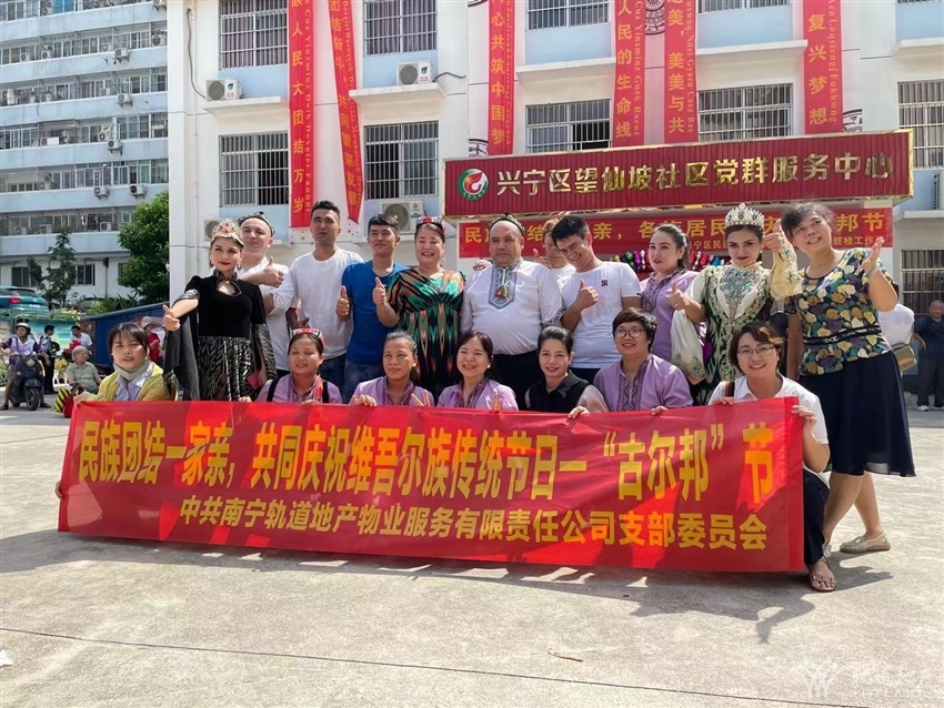 為弘揚民族文化,促進民族團結,鑄牢中華民族共同體意識,結合中國共產黨成立一百周年的契機,望仙坡社區(qū)、新疆駐桂工作組、興寧區(qū)民宗局于2021715日上午在望仙坡社區(qū)廣場開展古爾邦節(jié)民族文化宣傳活動,軌道地產物業(yè)公司黨支部作為黨建聯(lián)盟單位,受邀參加此次活動,與各族群眾一起共同慶祝維吾爾族傳統(tǒng)節(jié)日--“古爾邦”節(jié)。